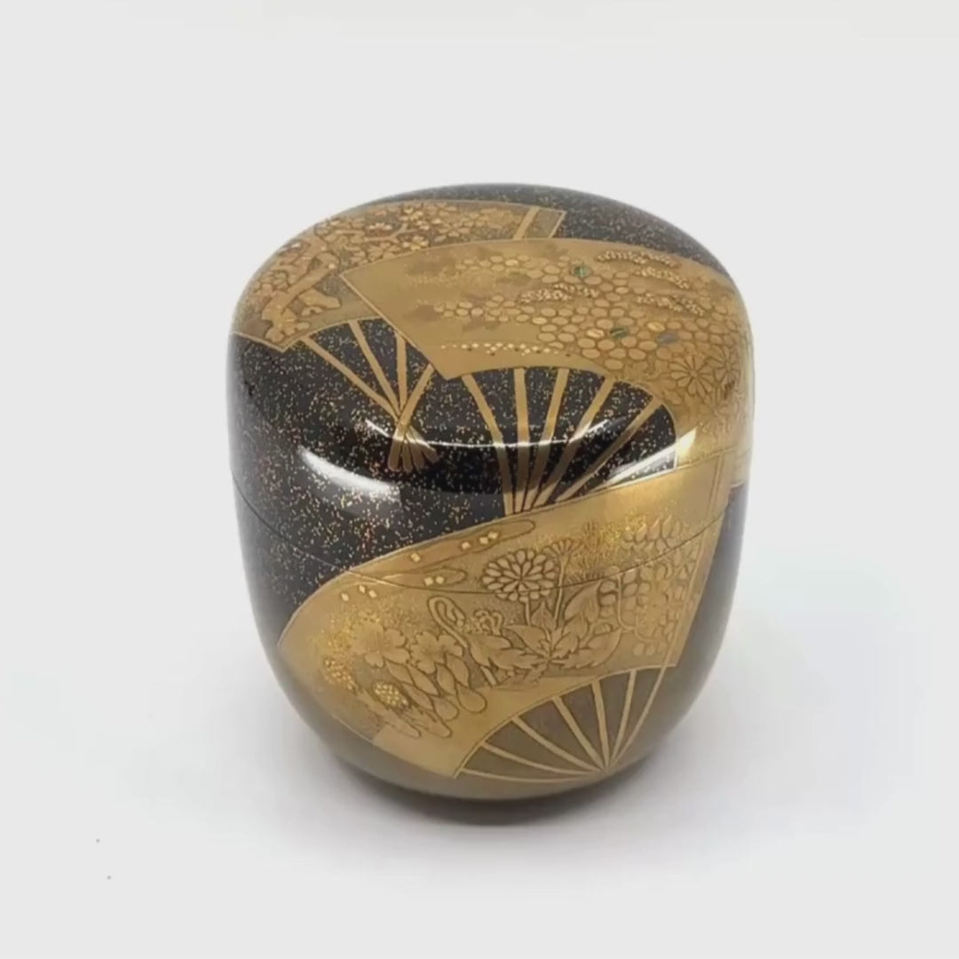 Natsume (boîte à thé japonaise) laque urushi et or, décor éventails et fleurs de Shikō Shibano