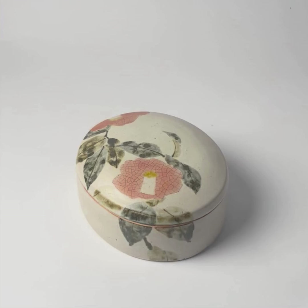 Boîte ovale en céramique japonaise de l'artisan d'art Seigō Maeda, qui attire l’œil par son harmonie et sa force et son très beau décor de camélias (tsubaki, symbole de beauté, d'amour et de perfection). De belles dimensions (longueur 20,6cm) et lourde (1,7kg), à la fois pratique et extrêmement décorative.