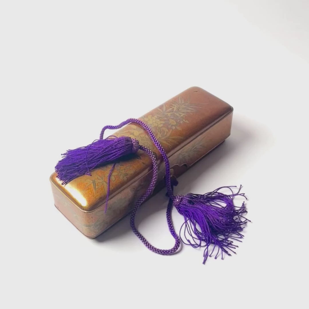 Les motifs complexes du décor sont réalisés à l'aide de diverses techniques de makie (poudre d'or) : hiramaki-e 平蒔絵 (laque en bas-relief) et nashiji 梨子地 (laque d'or saupoudrée, qui couvre l'intégralité du fond du décor) dans différentes nuances d'or. L'intérieur du tanzaku-bako est en laque urushi noire. Les décors sont extrêmement fins et délicats, ce qui en fait une pièce de grande qualité. Cette boîte est ancienne, fin du 19ème siècle (fin ère Edo our début ère Meiji) et est en bon état à l'exception de quelques signes visibles du temps qui passe : quelques traces d'usure, petits éclats et décoloration de l'or à certains endroits, qui sont visibles sur les photos. Il s'agit d'une antiquité qui a traversé les époques mais qui garde néanmoins toute sa beauté et sa rareté.