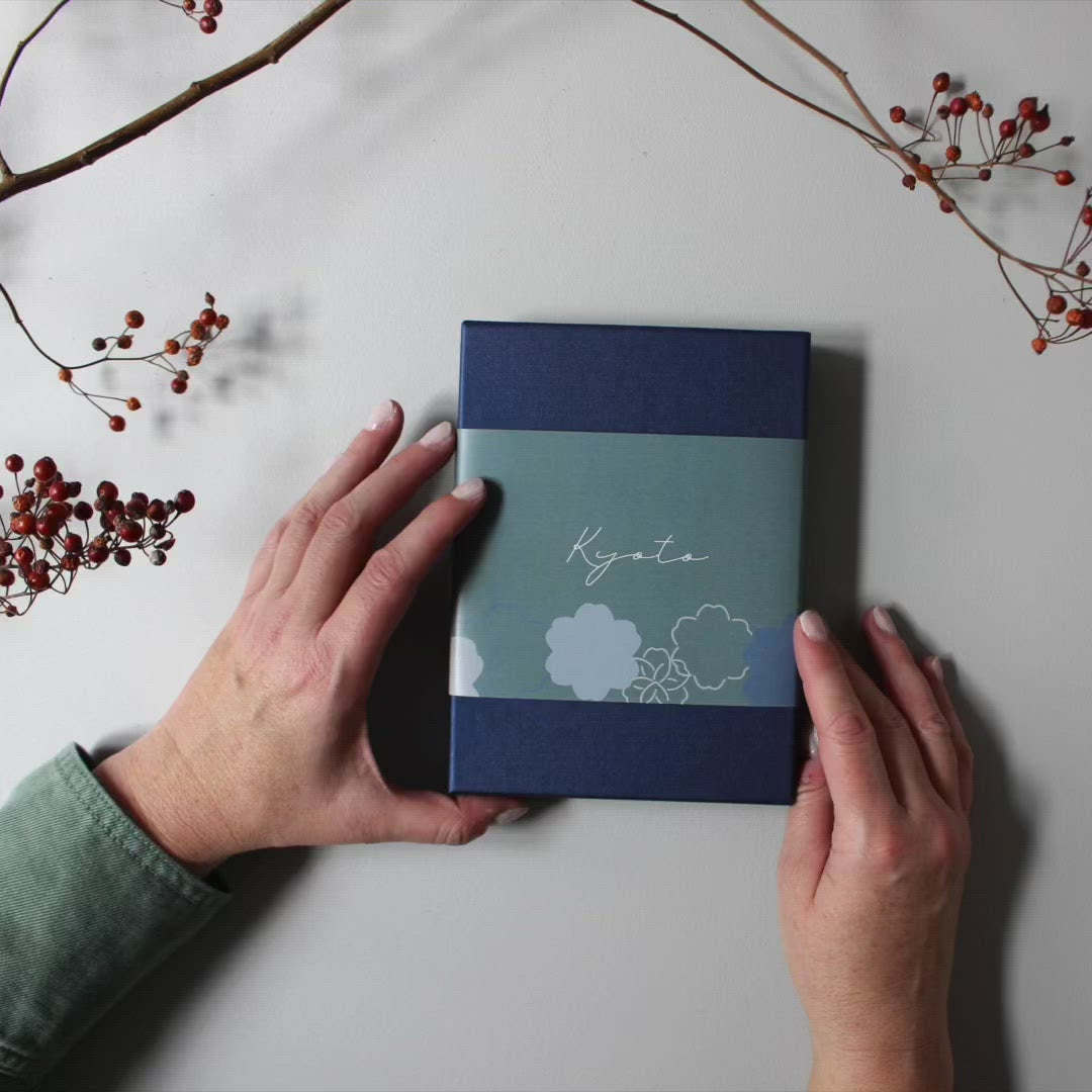 Ce guide contient 25 cartes imprimées sur du papier 350g Condat Périgord Mat (format A6), chacune avec au recto (qui est pelliculé) une très belle photo de Kyoto, et pour 24 d'entre elles, au verso, une boutique, son descriptif, son adresse et le nom de son compte Instagram. Une 25ème carte permet d'écrire un message au verso si l'on destine ce guide à quelqu'un. Ces 25 cartes sont abritées dans une jolie boîte bleue légèrement pailletée, et inclus également une brochure avec un plan. Un bandeau imprimé repositionnable maintient le tout. Il est expédié dans son furoshiki en textile écru, blanc ou bleu.