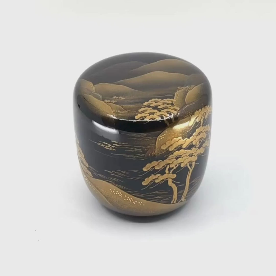 Ce natsume (boîte dans laquelle est placée la poudre de matcha lors de la cérémonie du thé japonaise) de Kosaku Kitahama, maître laqueur de Wajima également connu sous le nom d’artiste Soshin, est une pièce d’une grande élégance. Sur un contenant en bois léger entièrement recouvert d’une laque urushi japonaise d’un noir profond, se déploie un très beau paysage de la vallée de Hozukyō à l'ouest de Kyōto, avec collines, rivière et pins, réalisé à la poudre d'or selon différentes techniques de maki-e précieux.