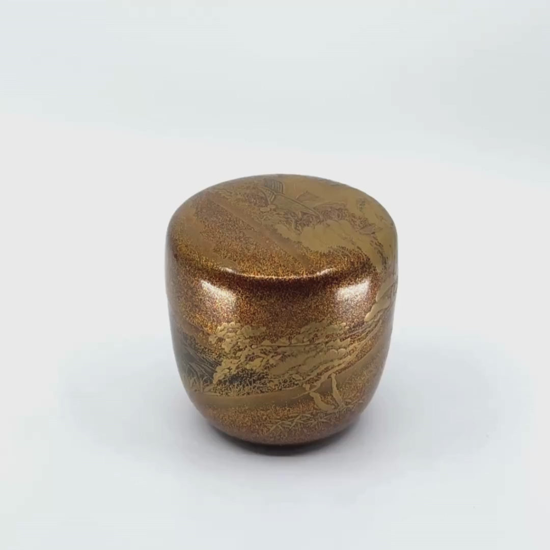 Ce magnifique et grand natsume (ōnatsume), destiné au service de l’usucha, le thé fouetté léger lors de la cérémonie du thé, se distingue par un décor complet d’une grande précision représentant un superbe paysage de pins et un pavillon. Le fond extérieur est un nashiji (or saupoudré) sur lequel se déploie un décor de pins, de sous-bois et d'un pavillon posé sur une plate-forme à pilotis (kake-zukuri). Ce décor, en fort relief, a été réalisé en taka maki-e, technique très complexe où la laque est montée en épaisseur avant l’application des poudres d'or pour créer un volume marqué. Les variations du sous-bois et les plans de nature sont traités par des variations selon la technique du nashiji, avec une densité de poudre d’or plus ou moins serrée qui dessine les lisières, les pentes et les passages d’ombre. L’ensemble présente un beau modelé de la lumière sur tout le pourtour du natsume.
