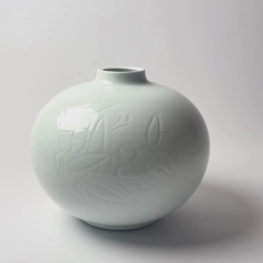 Ce vase en porcelaine blanche émaillée de Manji Inoue, d'une hauteur de 20 cm et d'une largeur de 21 cm, se distingue par sa forme ronde parfaitement équilibrée et ses délicates gravures de pivoines. Les motifs floraux sont minutieusement sculptés en relief, capturant subtilement la lumière pour créer un jeu d’ombres raffiné, tout en restant fidèles à l'esthétique sobre et épurée de l'artisan. La blancheur éclatante de la porcelaine, obtenue grâce à une cuisson maîtrisée, met en valeur la finesse des détails gravés et souligne l’élégance intemporelle de l’œuvre.