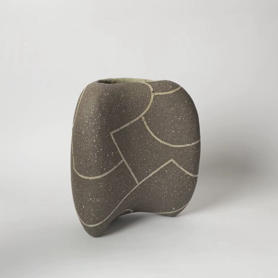 Pour ce vase-sculpture il a utilisé une combinaison d'argiles de Shigaraki et de Seto, qu’il a façonnées à la main avec une technique personnelle extrêmement compliquée, qui donne à la surface son côté brut et sablonneux et cette forme à la fois organique et très équilibrée. La force de ce vase-sculpture est accentué par les lignes abstraites blanches ondulant à la surface comme une cartographie poétique. Un travail d'art contemporain tout en étant intemporel et profondément japonais.