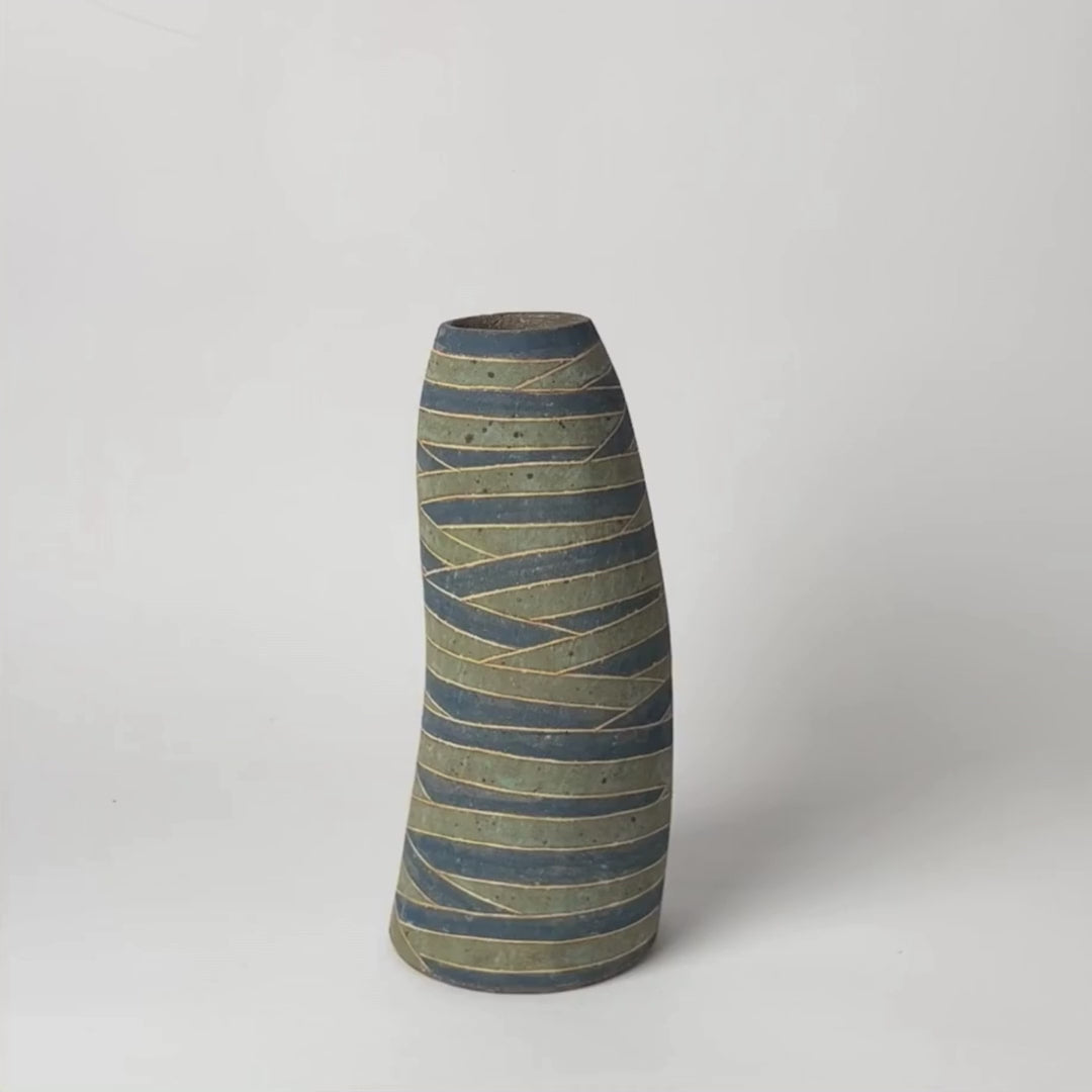 Ce vase-sculpture façonné à la main par Shingo Takeuchi se distingue par sa ligne contemporaine subtilement ondulante, comme animée d’un léger déséquilibre volontaire. Sa silhouette semble osciller imperceptiblement, entre verticalité et tension organique. Réalisé en grès, à partir d’un mélange d’argiles de Seto et de Shigaraki choisies pour leur texture et leur richesse en fer, il a une surface mate aux nuances chaudes. Le décor en incrustation (zōgan), hérité d’une longue tradition céramique japonaise qui consiste à incruster un engobe clair dans des motifs gravés, est revisité par Shingo Takeuchi sur ce vase avec une subtilité contemporaine, jouant sur la finesse du décor et la profondeur des matières. Des pigments aux tons contrastés viennent enrichir la surface avant qu’un engobe mat à base de cendre de riz ne soit appliqué. Après la cuisson en réduction, un brossage soigneux révèle les lignes protégées et les nuances enfouies, dans une belle harmonie de tons.
